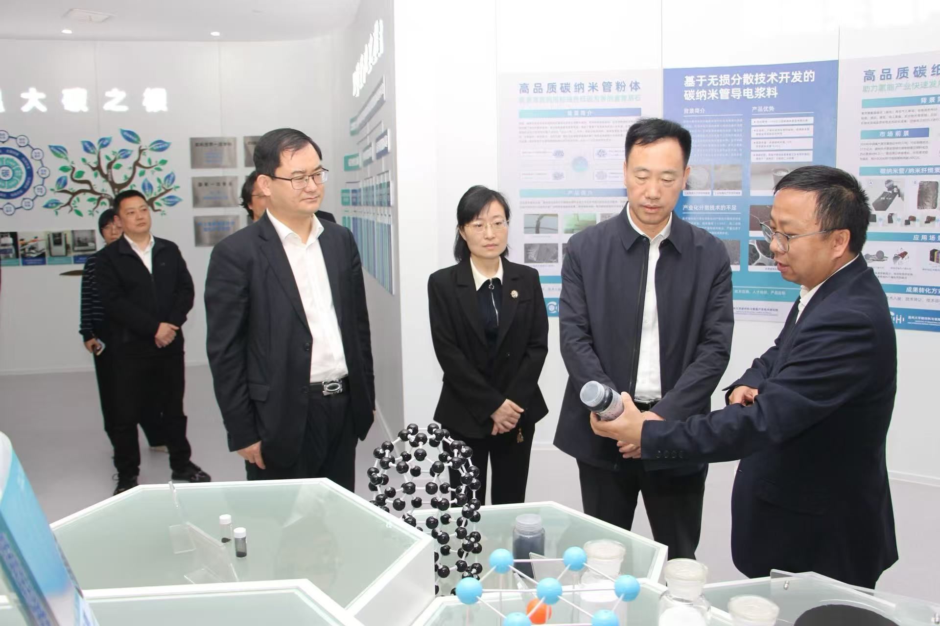 麻胜聪一行先后实地走访科研场地、核心仪器与中试平台,详细了解技术研发及产业化进展,重点听取研究院在碳纳米材料、碳基复合材料、氢能关键材料等领域的技术积累、研发成果与产业化布局。调研中,杨植院长详细汇报了碳纳米管宏量制备、硅基体碳纳米管生长、浆料分散等核心技术,以及硅碳负极、瑞碳材料应用成果与千万级规模产业化合作经验。